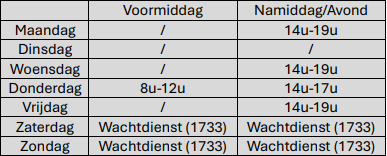 | Maandag | 8u - 12u30 | 14u - 16u | |